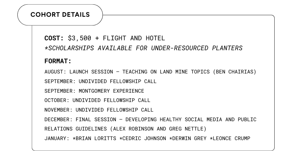 The Church Planter Cohort is an 8-month immersive experience designed to equip, empower, and connect church planters for lasting impact. Through a blend of written modules, live cohort calls, and in-person gatherings, planters will engage in holistic leadership development while building a network of peers and mentors who share their calling.