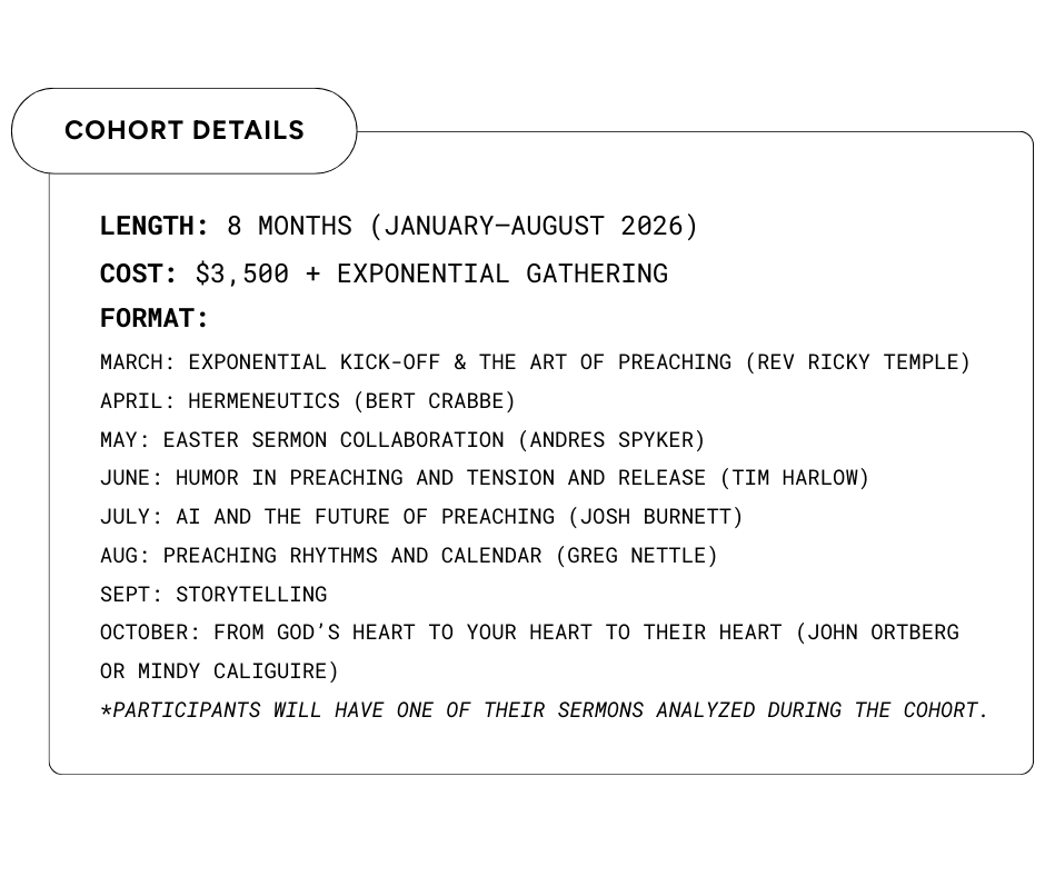 This preaching cohort is designed for communicators who desire to grow in both skill and soul. Participants will gain practical tools for crafting impactful messages while deepening their connection to God’s voice and their audience’s hearts. Each gathering will blend theological reflection, creative exploration, and peer feedback to help you preach with clarity, authenticity, and power.